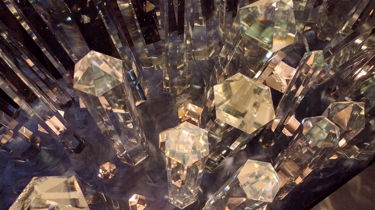 Die Spitzen der Kristalle sind dachförmig angeschliffen. Die außerordentliche Perfektion des Glasschliffs zeigte sich durch die präzise Übereinstimmung aller Flächen und Kanten. Dieses Foto wurde während der ersten Einleuchtungsprobe gemacht. Der strahlende und funkelnde Effekt faszinierte jeden Betrachter von der ersten Minute an. (Foto Hempe)