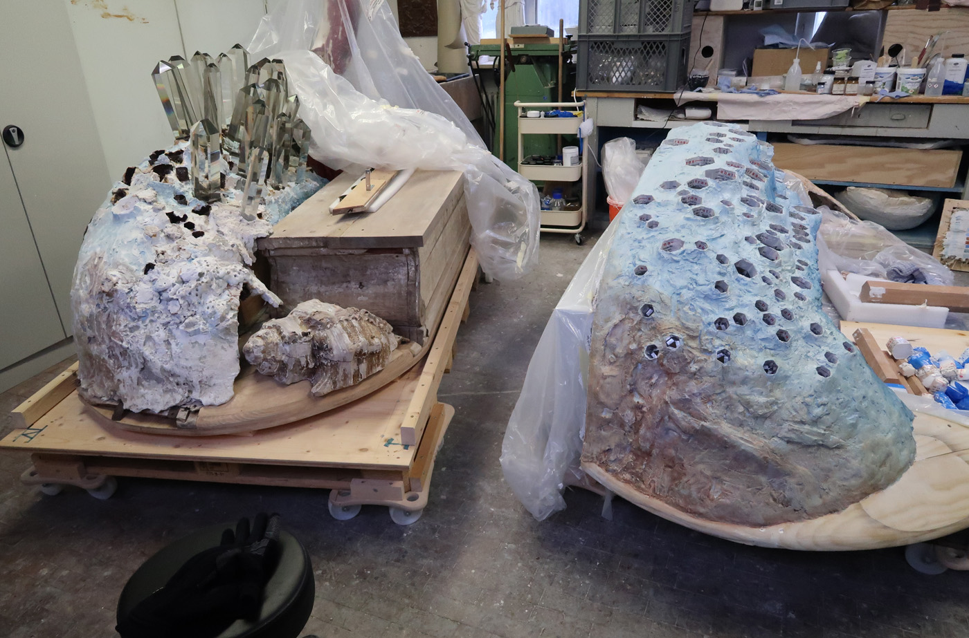 Die Stuckierung des Kristallfelsens mit Alabastergips und seine farbliche Gestaltung fertigte Veronika Lauber. Auf der linken Seite ist der bereits konservierte Originalthron zu sehen, auf der Rechten die Kopie noch ohne Kristallbesatz (Foto Mintrop)