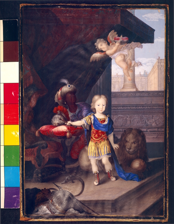 Kurz vor dem unerwarteten Tod des kleinen „Prinzen von Asturien“ stellt Bruni ihn noch einmal im antiken Imperatorenkostüm und mit allem Pomp und Würdezeichen eines barocken Weltbeherrschers dar…