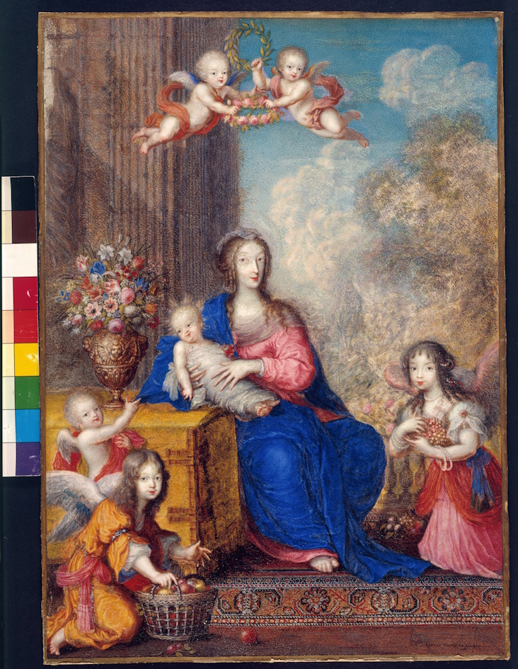 Kleines Engelchen? Der Miniaturist M. Scharner stellt den jugendlichen Max Emanuel als geflügelten Himmelsboten zu Füßen Henriette Adelaides in der Pose der Gottesmutter da (- sein jüngerer Bruder in der Rolle des Christkinds war folgerichtig für eine kirchliche Laufbahn vorgesehen…)