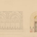 Im Zentrum des stuckierten Deckengewölbes erscheint das christliche Kreuz, umgeben von Sphinxen als Symbolen der Weisheit und des Mysteriums. Darunter zeigt die Längswand hinter den gereihten Büsten noch die zunächst anvisierte Verkleidung in Stuckmarmor, die jedoch aus Kostengründen durch Holztäfelungen ersetzt wurde. Die skizzierten Wandgemälde sind im antikisierenden Reliefstil gehalten. In der späteren Ausführung traten historistische Kostümszenen an ihre Stelle. Inmitten des klassizistischen Dekors dürften sie als Fremdkörper gewirkt haben – ähnlich wie die nazarenischen Fresken der Königswohnung, deren Ausführung der erboste Klenze zwanzig Jahre zuvor nicht hatte verhindern können. Über dem rechts gezeichneten Portal wacht der später durch Max von Widnmann modellierte „Genius des Studiums“ über die königlichen Geschichtsmeditationen.