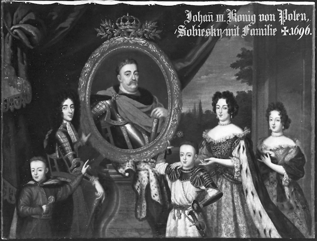 „Familienbild“ der königlichen Sobieski-Familie mit der jungen Therese Kunigunde neben ihrer Mutter ganz rechts (Schloss Neuburg)