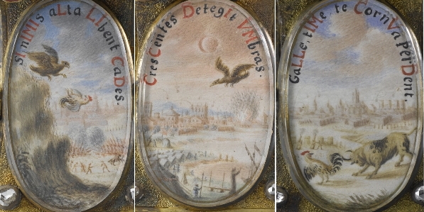 sI nIMIs aLTa LIbent CaDes – „Wer zu hoch strebt, fällt tief“. In der Schlacht am Schellenberg (2.7.1704) müssen die französischen den kaiserlichen Truppen weichen. // CresCebtes DetegIt VMbras – „Die Sonne lässt seinen Schatten aufsteigen“: Der Adler, der siegreich zur Sonne fliegt, wirft seinen Schatten auf Max Emanuels unterlegenen Truppen bei Höchstädt (13.8.1704) // GaLLe tIMete CurnVa PerDent – „Du Gockel fürchte die Hörner, die dich vernichten!“ „John Bull“ verdrängt den gallischen Hahn: Am 25.11.1704 übergeben die Franzosen die Festung Landau den britischen Belagerern.