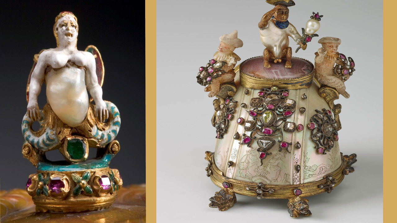 Frühe Arbeiten in der Schatzkammer zeigen Fabelwesen wie die fischschwänzige Sirene, die auf die Herkunft der Perlen aus dem Wasser verweisen – und aus fernen Weltgegenden, in denen auch der freche Affenkönig haust, der auf einer gravierten Perlmuttschnecke Hof hält…