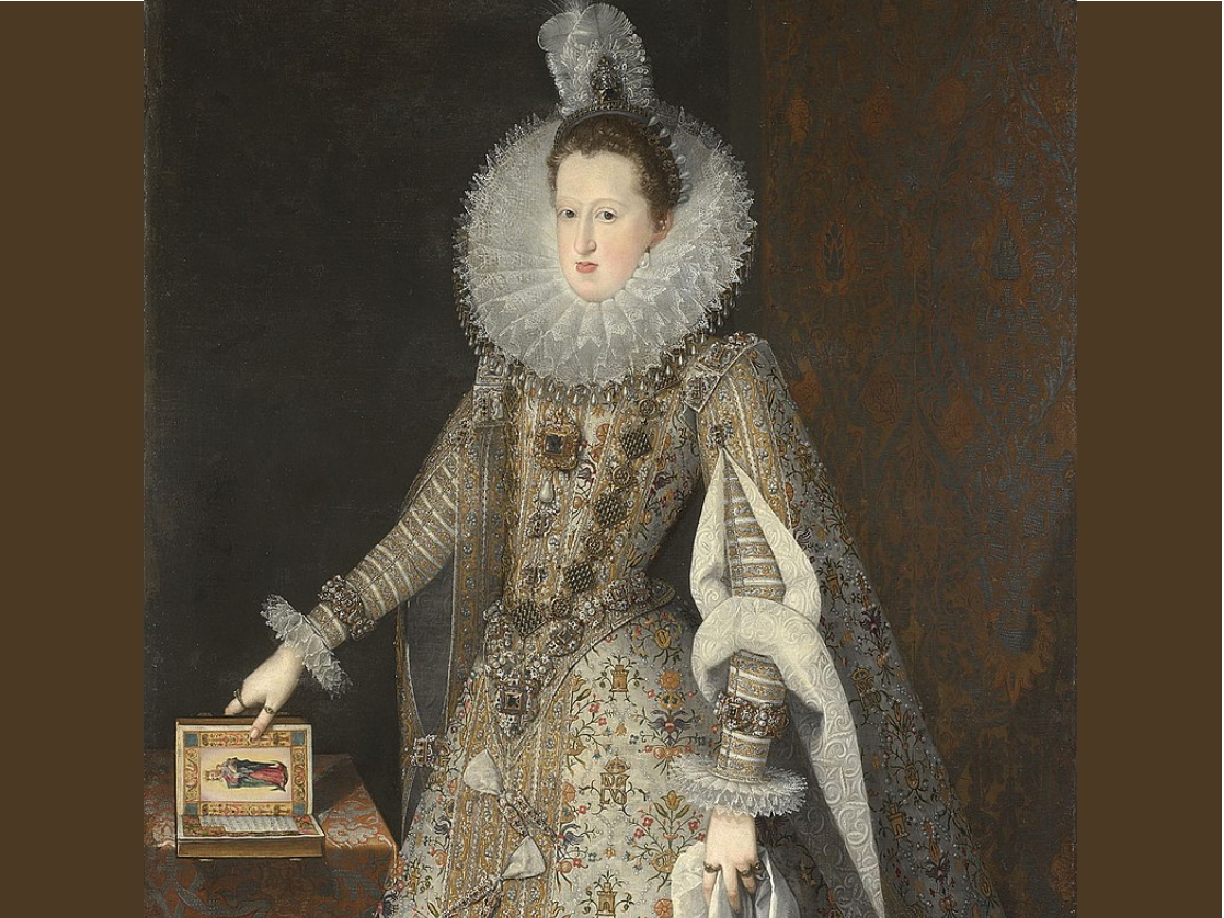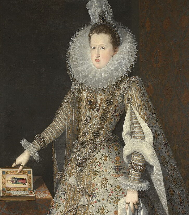 Die Peregrina am Kostüm der spanischen Königin Margarethe (1584-1611), der Gemahlin Philipps III. Margarethes Onkel war Herzog Wilhelm V. von Bayern. Ihr Enkel Karl II. heiratete die Wittelsbacherin Maria Anna, Johann Wilhelms Schwester