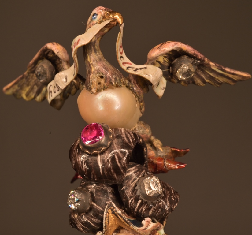 Hervorstechendes Charakteristikum unserer Statuette ist die Verwendung großer Perlen, die als Leib des Johann-Wilhelm-Figürchens das bestimmende, formgebende Element des barocken Juwelen-Kunstwerks darstellen. Perlen faszinieren von jeher: Als rätselhaftes Naturwunder entsteht ihr vielfarbiger Schimmer in unscheinbarsten Muschelschalen. Nicht ohne Grund stellten antike Künstler Venus, die aus Meeresschaum geborene Göttin der Schönheit, in einer Muschel dar. Später wurde die perfekte Perle dann zum Symbol Christi, der rein, ohne menschliches Zutun, im Leib seiner jungfräulichen Mutter Maria wächst. Weil sie schwer zu finden und kaum zu bearbeiten sind, wurden Perlen über Jahrhunderte teurer gehandelt als Gold. Als prestigereiche Schätze voll symbolischer Bedeutung wurden sie teils regelrecht inszeniert.