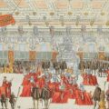 Bühne frei: Turnier-Pantomime im Georgssaal der Neuveste anlässlich der Fürstenhochzeit von 1568, Graphik von Nikolaus Solis