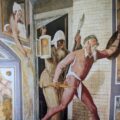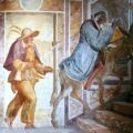Typische Szene aus der commedia dell’arte: Pantalone und Zanni auf nächtlicher (Chaos)Expedition – Wandgemälde der Landshuter „Narrentreppe“, 1575/79