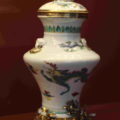 Vom Glückssymbol zum besiegten Dämon: Wie ein geliebtes Schoßhündchen ringelt sich der Drache zu Füßen der barmherzigen Schutzgottheit Guanyin – als Begleiter und himmlisches Reittier! Europäische Betrachter des 18. Jh. erinnerte die junge (Nachwuchs gewährende) Göttin mit Baby und schlangenartigem Ungeheuer allerdings mehr an die „eigene“ Darstellung der Jungfrau Maria als Himmelskönigin, die den Satansdrachen zu Boden tritt!