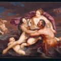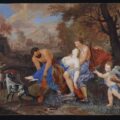 Manches scheint sich tatsächlich zu fügen: So berichtet der altrömische Dichter mit gotteslästerlichem Augenzwinkern, wie die schöne, in der freien Natur aber eher unbeholfene Schutzherrin der Liebe keuchend mit Pfeil und Bogen durch die Wälder hetzt, um – selbst verliebt – dem angebeteten Sterblichen zu imponieren. Von einem Wolfsfell um ihre Taille erwähnt Ovid in seinen Versen hingegen nichts. Wer der ältere Gefolgsmann sein soll, bleibt gleichfalls ungeklärt. Ist es ein Jagdgefährte des Adonis oder gar Venus‘ illusionsloser Ehemann Vulkan?? Und dass sich der Galan mehr mit seinem Jagdhund als der Herrin der Schönheit beschäftigt, steht gleichfalls nicht in den „Metamorphosen“.