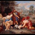 Abseits dieser Erkenntnis bestand jedoch bezüglich des konkreten Inhalts der beiden Darstellungen eben schon sehr früh, nämlich bereits in den ersten erhaltenen Gemäldeinventaren der Residenz aus den 1770er Jahren, schlecht kaschierte Ratlosigkeit, die seitdem nie verflogen ist. Die darin verzeichneten Bildtitel für die damals im Rokoko-Kabinett der Reichen Zimmer befindlichen Miniaturen: „Die verliebte Venus bey ihren geliebten Adonis befindlich, welcher mit einem Hunde scherzet“ und „Die betrübte Venus über den Tod ihres geliebten Adonis“ beziehen sich auf eine der klassischen Verwandlungssagen in Ovids „Metamorphosen“. Allerdings pass(t)en sie damals wie heute nicht recht mit den Einzelheiten der Bilddarstellungen zusammen. Schade für die damaligen Bilderklärer wie für uns – denn erfahrungsgemäß ist eigentlich der Hinweis auf Ovid bei mythologisierender Renaissance- und Barockmalerei in 90 von 100 Fällen eine sichere Bank. Gerade die tragische Liebesgeschichte der Schönheitsgöttin Venus mit dem attraktiven, leider rasch tödlich verunfallten Jäger Adonis wurde vielfach von Tizian bis Rubens rauf und runter gemalt, gemeißelt und gezeichnet.