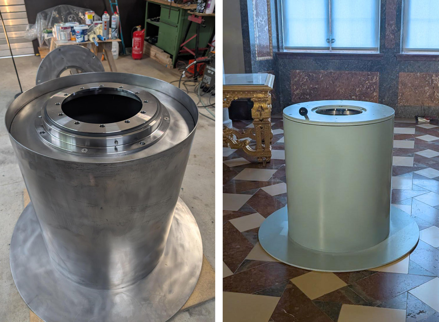 links: Der Sockel während seiner Konstruktion. Die Innenkonstruktion mit dem vertikalen – jedoch verdeckten – Kugellager ist einsehbar. © BSV/ Nikolic