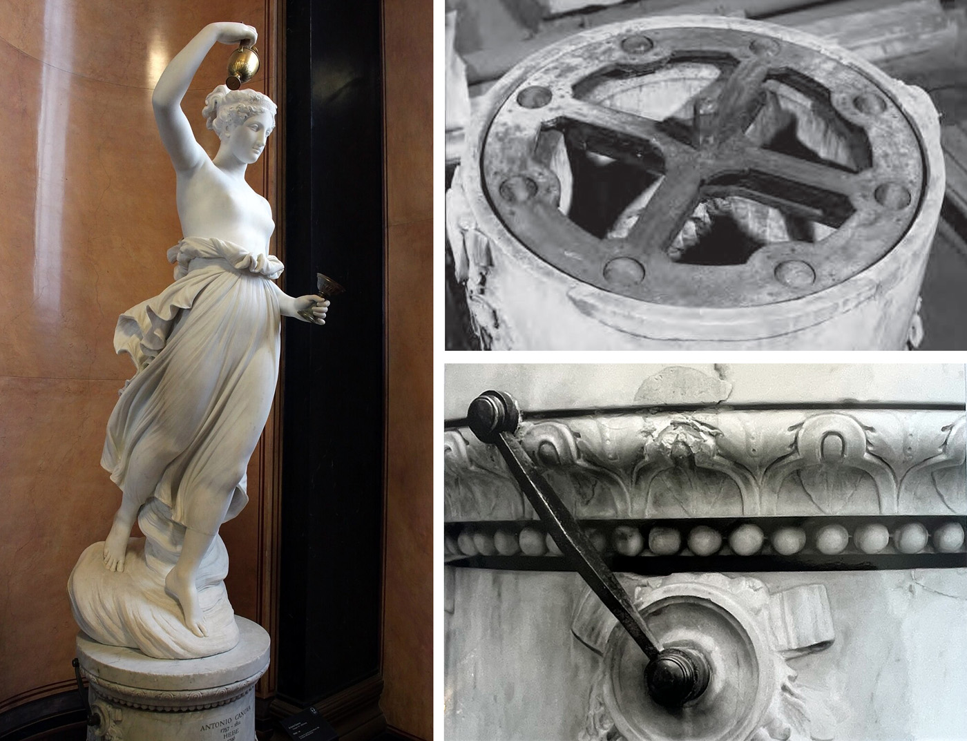 links: Statue der Hebe; rechts oben: Sockelinnenseite mit montiertem Kugellager auf ringförmigem Lagersitz sowie eingebauter kreuzförmiger Trägerkonstruktion mit zentralem Zapfen (jeweils Stahl), Zustand vor der Bearbeitung. © Aurelia Badde; rechts unten: Detail einer von zwei seitlich angebrachten Schließvorrichtungen (Messing), Zustand vor der Bearbeitung. © Aurelia Badde