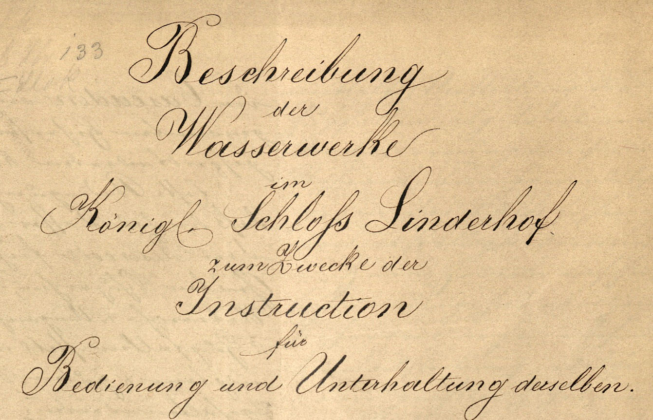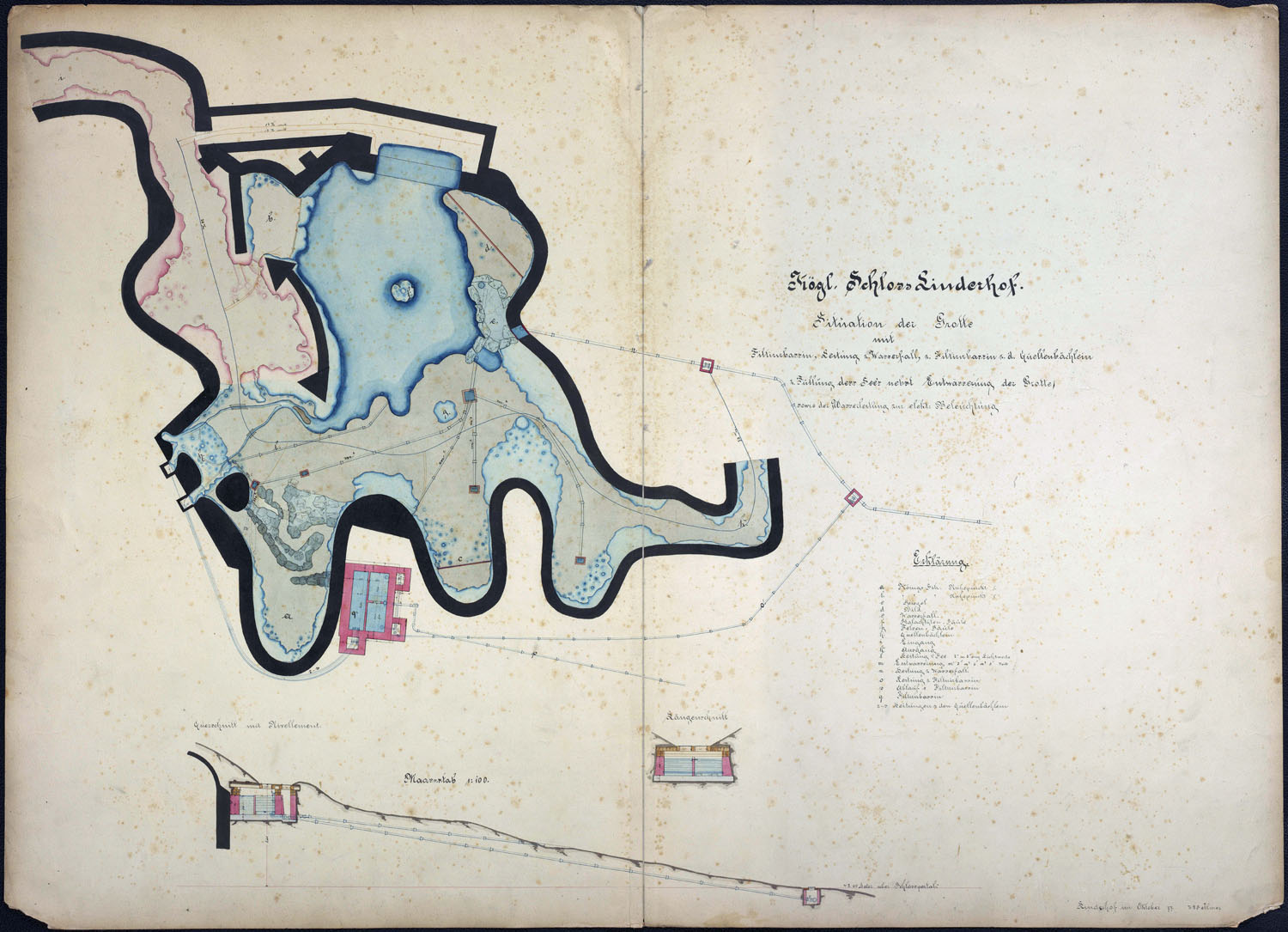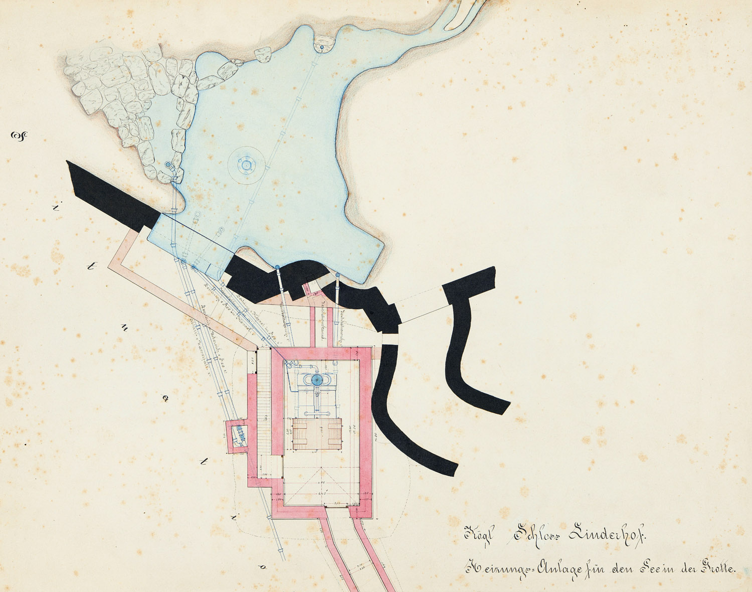 Über die Umsetzung der königlichen Wünsche, unter anderem einen Warmwassergrottenpool im Anblick von Tannhäuser und Venus auszuführen, sind wir glücklicherweise durch eine ausführliche Beschreibung (konzipiert als Bedienungsanleitung) aller Wasseranlagen im Schlosspark Linderhof aus dem Jahr 1878 der beauftragten Firma „Gas- und Wasserleitungs-Geschäft Stuttgart“ informiert, die zudem durch detaillierte Pläne ergänzt wird.