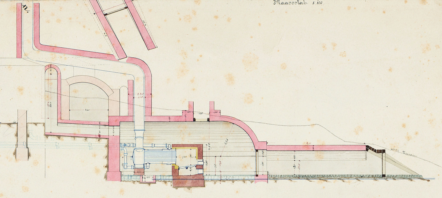 Vor der Venusgrotte verteilte sich die Hauptwasserleitung in kleinere Leitungen zum oberhalb gelegenen Maschinenhaus, zu einem extra angelegten Filtrierbecken sowie direkt zu einem „gemauerten Sammelkasten mit ca. 4 m³ Gehalt, von welchem aus der Abfluss als Wasserfall“ in die Grotte fließt. Dieses Wasser konnte ungefiltert genutzt werden, durfte aber keinesfalls mit dem Seewasser in Berührung kommen und wurde extra abgeleitet. In einem schon mehrfach in dieser Blogreihe gezeigten Situationsplan aller Wasserleitungen für die Grotte datiert auf Oktober 1877, sind die verschiedenen Verteilerschächte und Leitungen innerhalb und außerhalb des Grottenbaus detailliert verzeichnet. Über den Ausgangstunnel wurde eine weitere Leitung zu den verschiedenen Beleuchterpositionen für die Kühlung der Farbgläser der elektrischen Beleuchtung gelegt, deren Funktion bereits in einem anderen Beitrag erläutert worden ist.