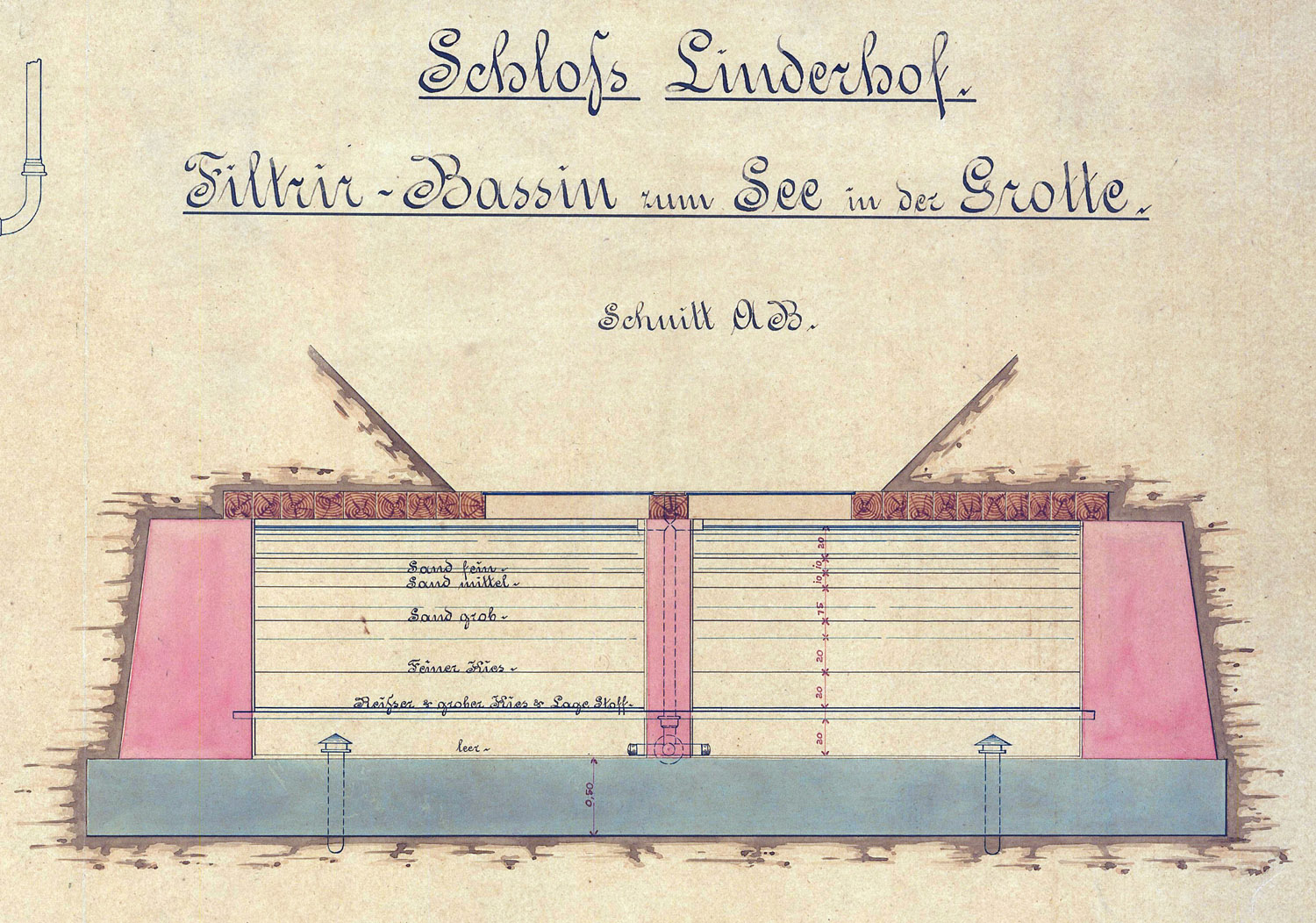 Oberhalb der Grotte (auf dem Plan unten dargestellt, da er gesüdet ist) wurde das eben schon erwähnte „Filtrir-Bassin“ angelegt. Für die Befüllung des Grottensees mit kristallklarem Wasser durchlief das frische, aber kalkhaltige Bergwasser dort zwei schichtweise mit Sand und Kies in verschiedenen Korngrößen gefüllte Becken, um schließlich durch Mauerschlitze in einer großen „Vorratskammer“ gesammelt zu werden.