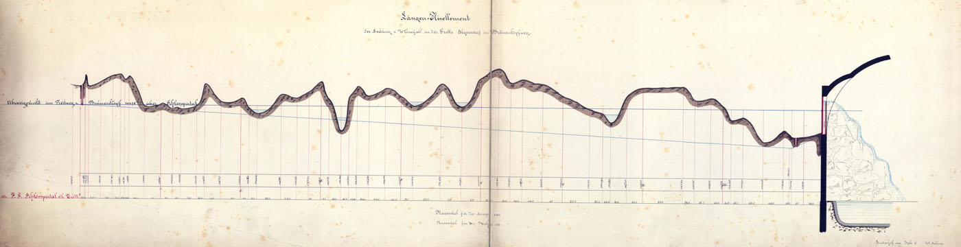 Das akkurat gezeichnete Nivellement über Stock und Stein vom Brunnenkopfreitweg bis zur Außenwand der Grotte hat sich erhalten und gibt spannende Einblicke in die Vermessungstechnik dieser Zeit.